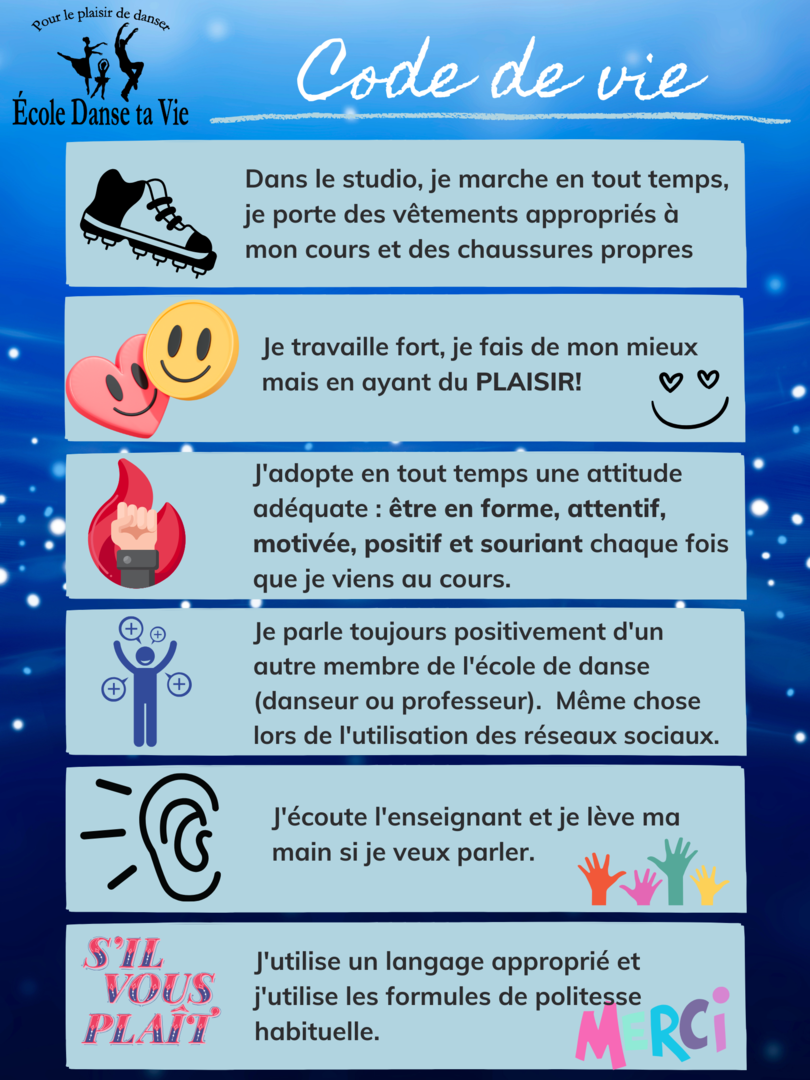Si vous souhaitez annuler, envoyez-nous un courriel AVANT le troisième cours à : infos@ecoledansetavie.com.